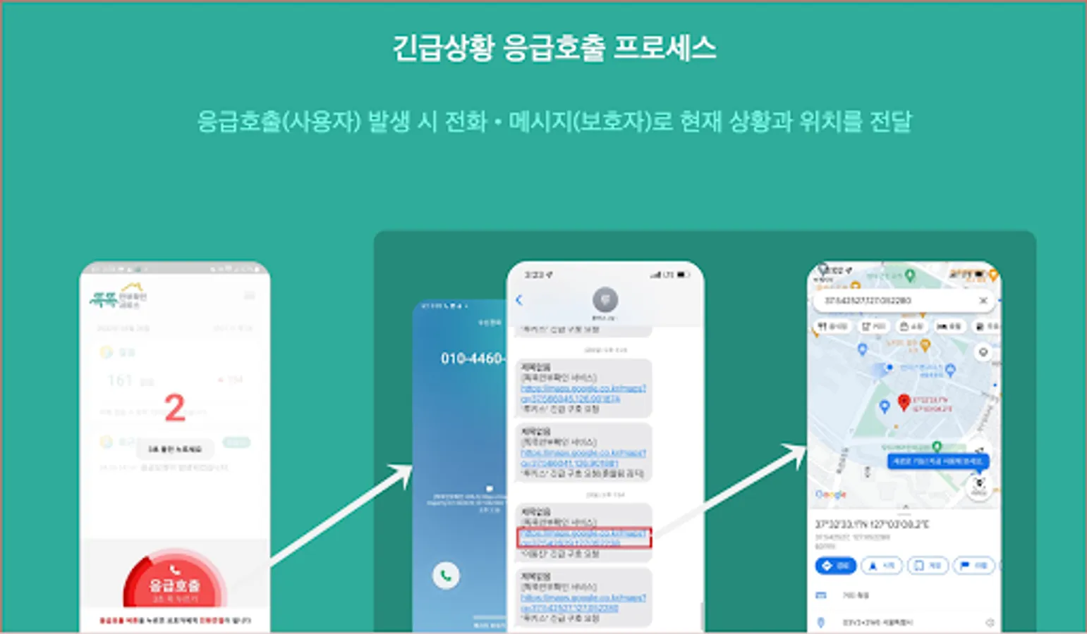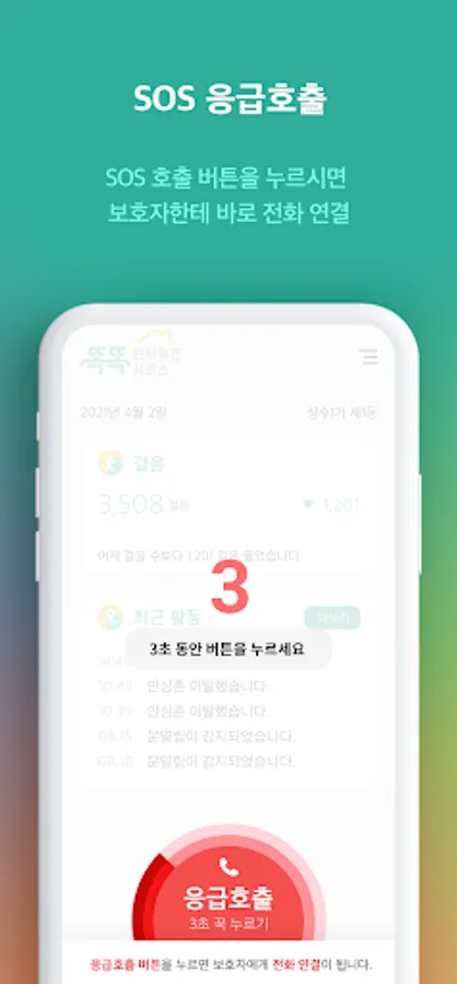 It always collects user data even when the app is not in use (in the background), determines the current location in case of an emergency, calls the registered guardian, and notifies an emergency by sending location information in a message.