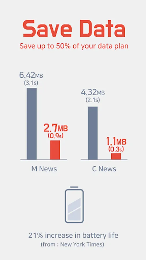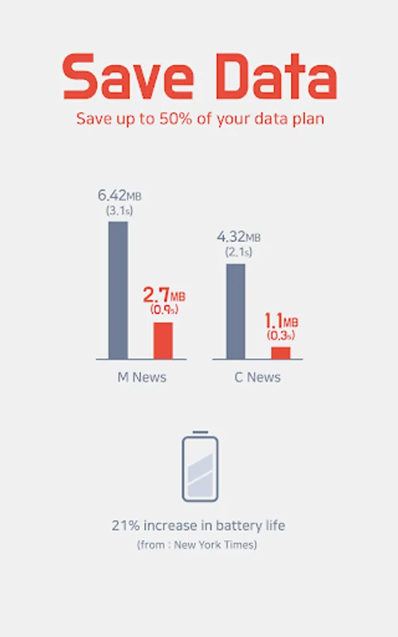 Unicorn saves the data expense that ads waste up to 4 times through blocking ads, and makes web surfing up to 3 times faster. Also lighter web surfing increases your battery life up to 21%.