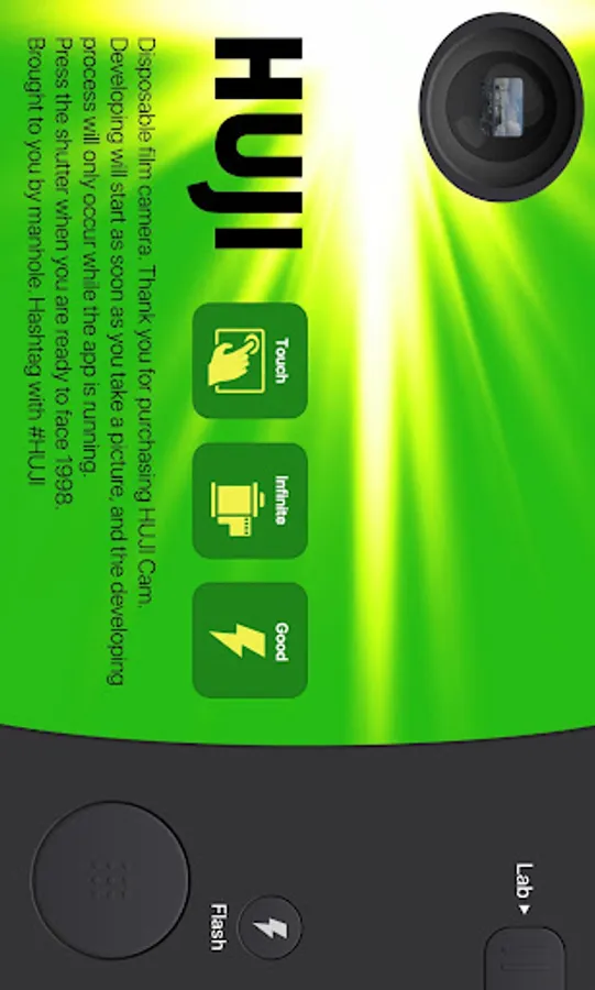 DISCLAIMER NOTICE: HUJI Cam IS PROVIDED AS MANHOLE'S OWN PRODUCT. THIS APP IS NOT THE OFFICIAL APP OF FUJIFILM OR ANY OTHERS. MANHOLE HAS MADE EVERY EFFORT TO ENSURE NOT TO INFRINGE OTHER'S COPYRIGHTS OR TRADEMARKS.