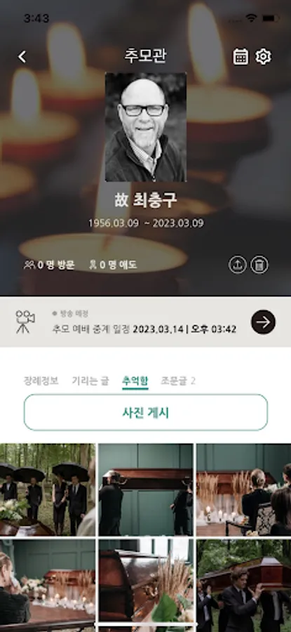 메모리온에서 중계하는 장례식에 참여하시고, 그분들의 추모관에 마음을 전달하세요.