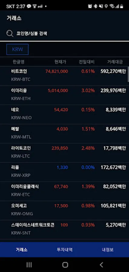 You can see the price and transaction amount for the list of cryptocurrencies listed on Upbit.