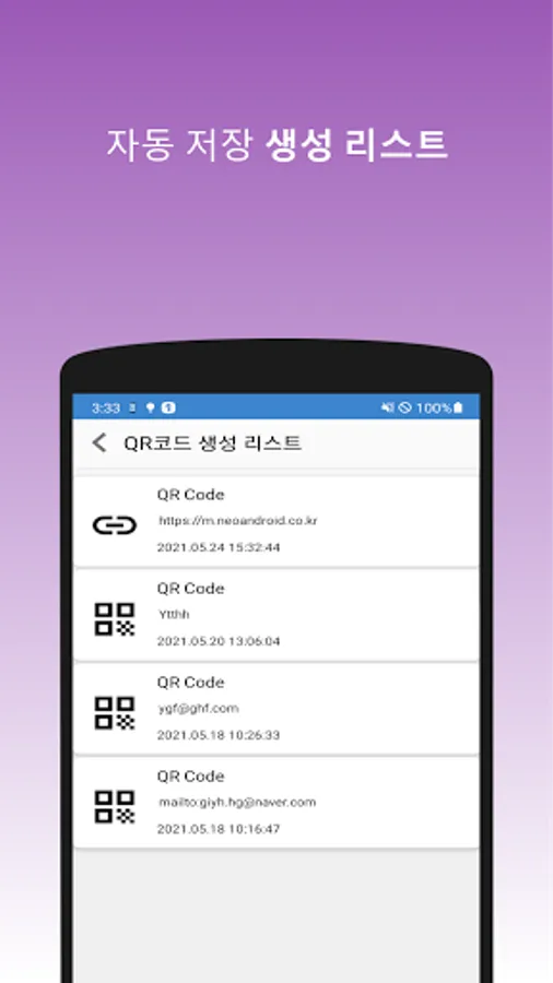 Scanned and generated QR codes are automatically saved and can be viewed at any time.