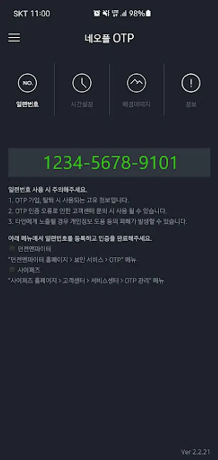 The OTP authentication number is automatically renewed every 30 seconds. A new authentication number is not generated while the application is floating in the background without being terminated.