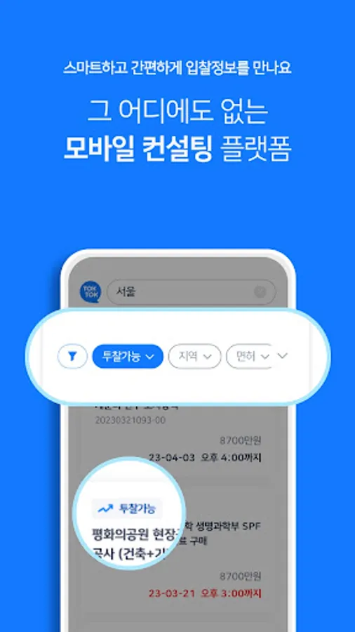 비드톡톡은 복잡하고 다양한 전자입찰 시장의 환경 속에서 쉽고 간편한 플랫폼을 지향합니다.