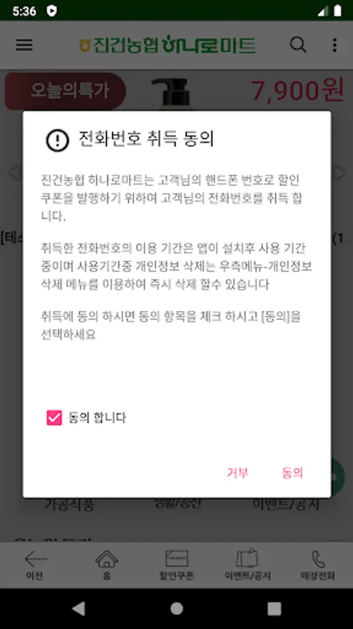 - 전화번호 : 고객님의 전화번호를 이용하여 할인쿠폰을 발행하여 진건농협 하나로마트에서 할인 혜택을 제공하기 위함 입니다.