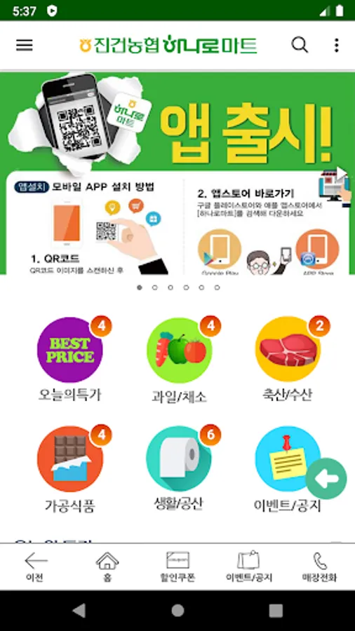 오늘의 특가 상품 부터 농/수/축산, 공산, 생필품등 진건농협 하나로마트의 할인상품을 확인할 수 있습니다