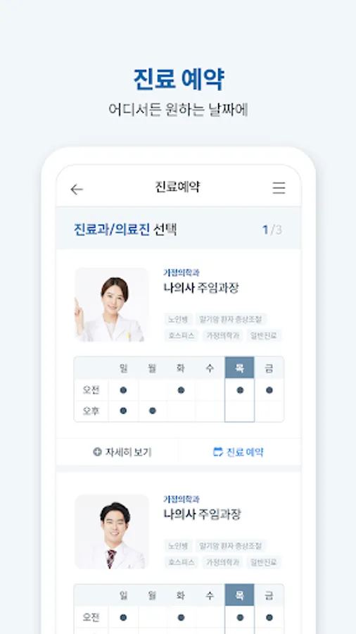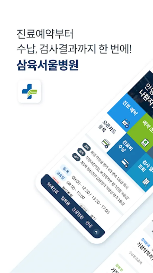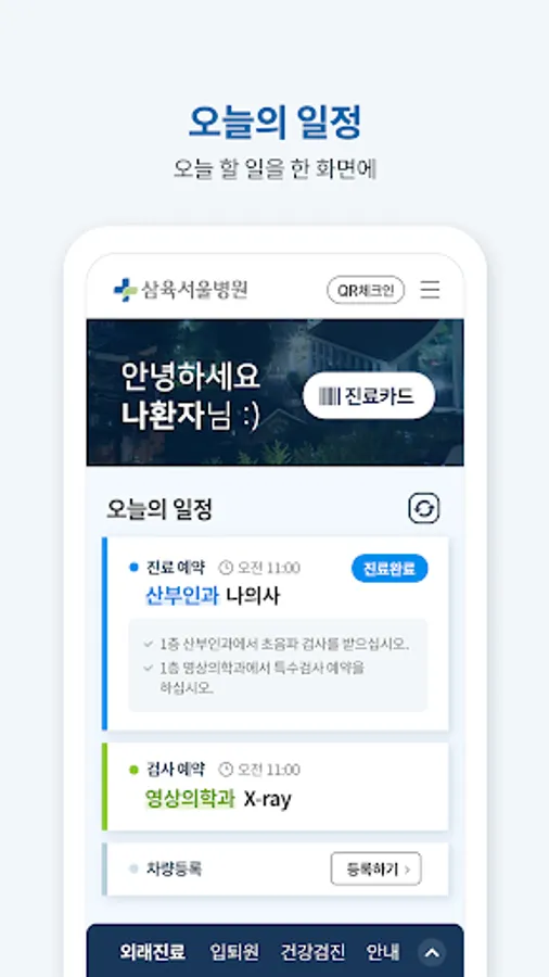 예약, 수납, 오늘의 일정, 전자처방전, 검사결과 확인 등 다양한 진료 편의 서비스를 제공합니다.
