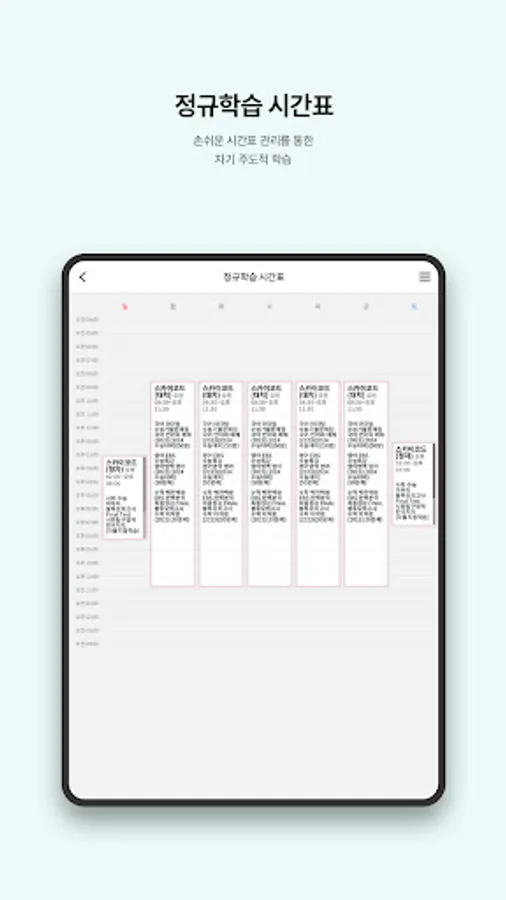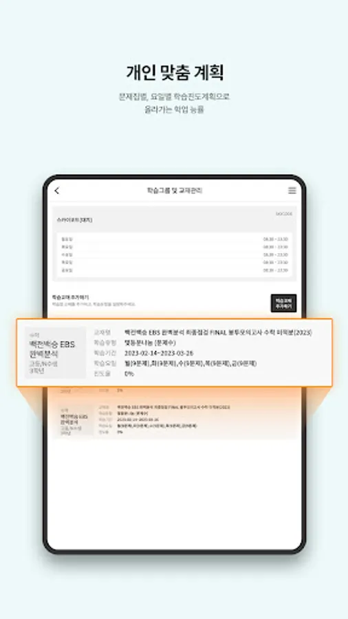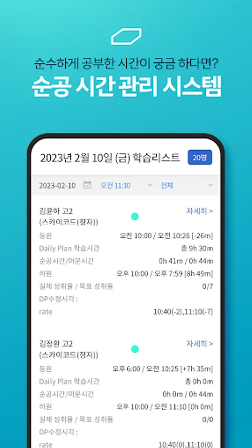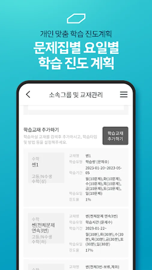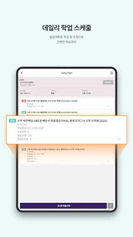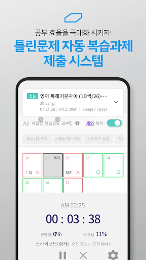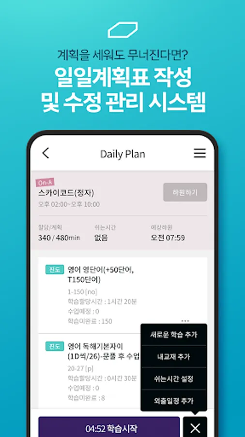 Daily schedule creation and revision management: This is a system that helps you maintain your progress plan. Even if you set up a progress plan, the situation changes every day, such as school performance evaluation, unit evaluation, and school assignments. So even if you set up a pacing plan, it's difficult to keep it the way it is, and it changes so often that many students give up on pacing. By the way, if the daily learning plan can be changed based on the progress plan, the progress plan can be maintained. Of course, even if it is not executed 100% according to the progress plan, the progress plan that needs to be done is always managed and presented. To create a daily planner, first add new learning (materials that are not registered in the progress plan, such as performance evaluation and school assignments), add internal textbooks (if you study textbooks registered as progress textbooks to prepare for unit evaluation without a progress plan), You can set an outing (hospital, family meal, group assignment, etc.) If this is added, the existing progress plan allows the amount of learning to be modified. In the daily planner, the important thing is to enter the expected learning time for each plan for each problem set. So, when the House of Representatives is possible, it shows the estimated House of Representatives time. Of course, even if you initially plan, after a few hours, it doesn't go as planned. So, the daily schedule can be modified in the middle of learning. By doing this, it helps the student to have a sense of goal that he must always make a plan and finish it by when, not the habit of studying without any plan. Students who do well according to their plans become students with good metacognition.