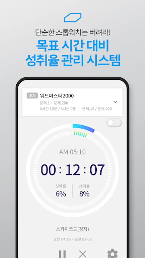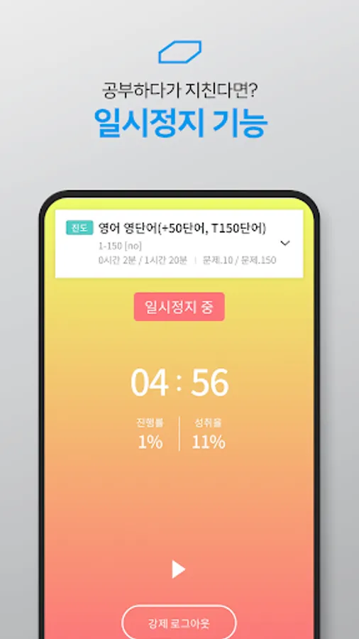 Pause function: If there is a situation where you need to stop learning for one reason or another in the middle of learning, there is a pause function. You can go to the bathroom or go to the convenience store for a while. In this case, learning is counted, but it is not included in net time. In learning counting, it is grayed out.