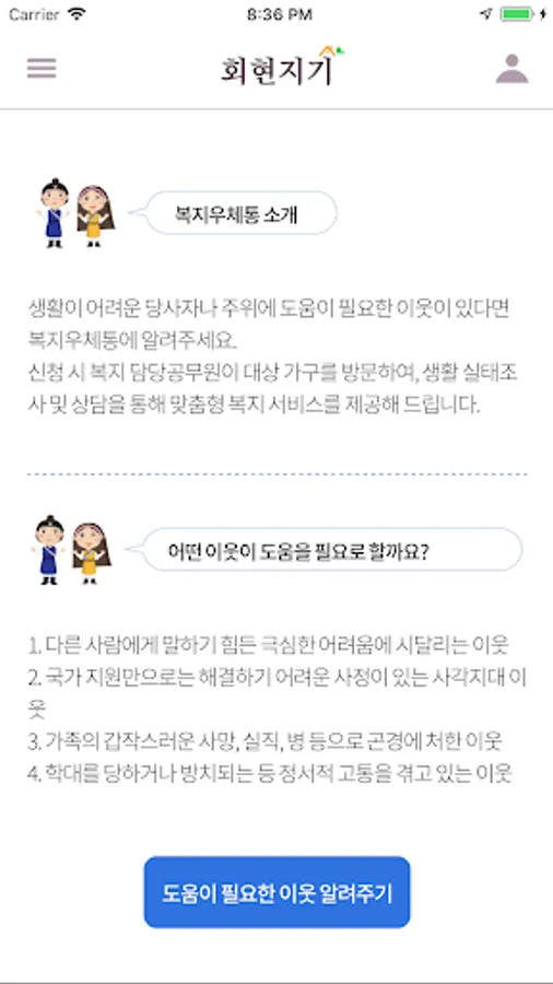 If you have difficulties in living or you need to help others around you, we will provide you with customized welfare services through a survey of living conditions and counseling.