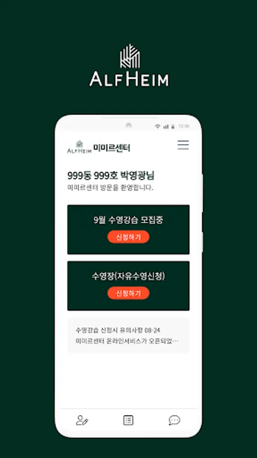 This is an application service that allows you to use various sports facilities and community facilities provided by Doosan Alfheim Mimir Center for residents. We provide services that can support not only reservations for facilities such as swimming, golf, and fitness, but also application for related classes. We would like to ask the residents of Doosan Alfheim, who pursue a hygge life, the secret of happiness in Northern Europe, to use it a lot.