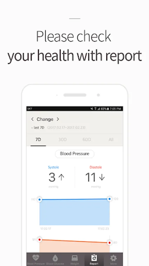 - Report: BP Diary announces the analyzed changes and the average value of your total entered data in 7 days, 30 days, and 60 days.