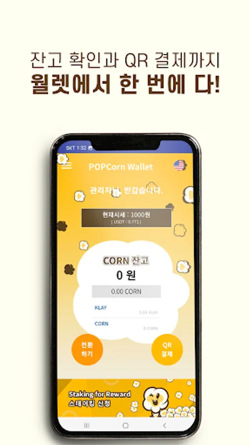 팝콘 월렛은 코인 유틸리티 앱으로 콘 코인을 전송 받고 보내는 기능을 기본으로 하여 팝콘 NFT 마켓에서 NFT를 구매 후에 스테이킹이을 하여 보상을 받을 수 있고 보상을 받은 콘을 통해 다양한 상품을 구매 할 수 있는 유용한 플랫폼 입니다.