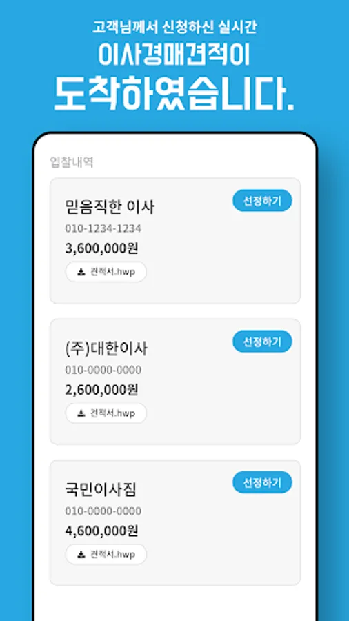 As the first moving auction platform in Korea, customers can view the details of the companies participating in the moving auction at any time during the moving auction bidding, but the companies participating in the bidding cannot view customer information until they are selected by the customer.