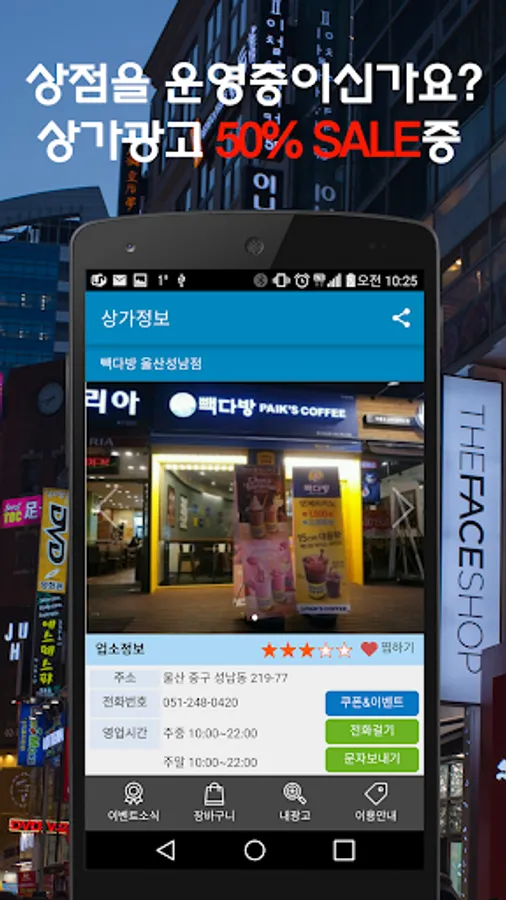 업주님들께서는 상가 홍보 등록은 물론 이벤트, 할인쿠폰등의 기능을 제한없이 언제나 무료로 이용이 가능합니다. (단.등록은 유료)