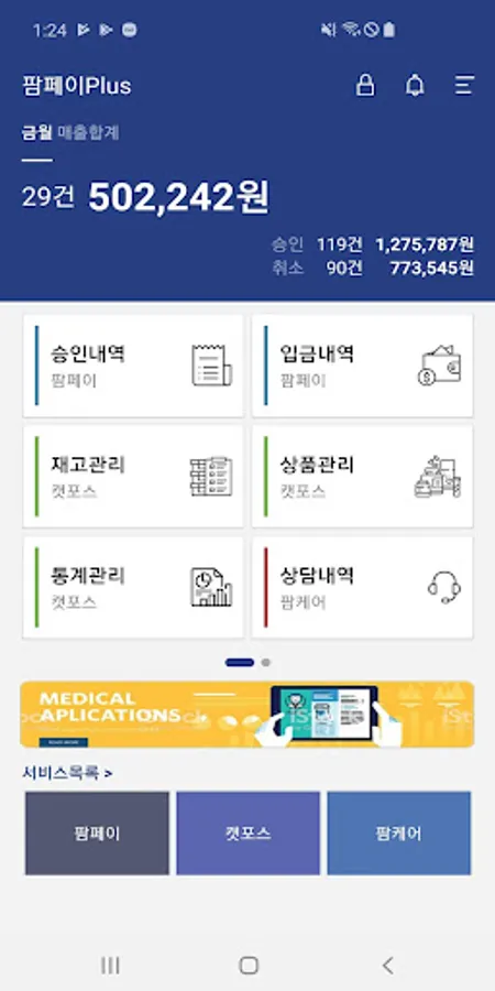 You can use services such as sales history, product management, inventory management, pharmacy counseling in one app through authentication of the services you are using (Palmpay, Cat Force, Palm Care).