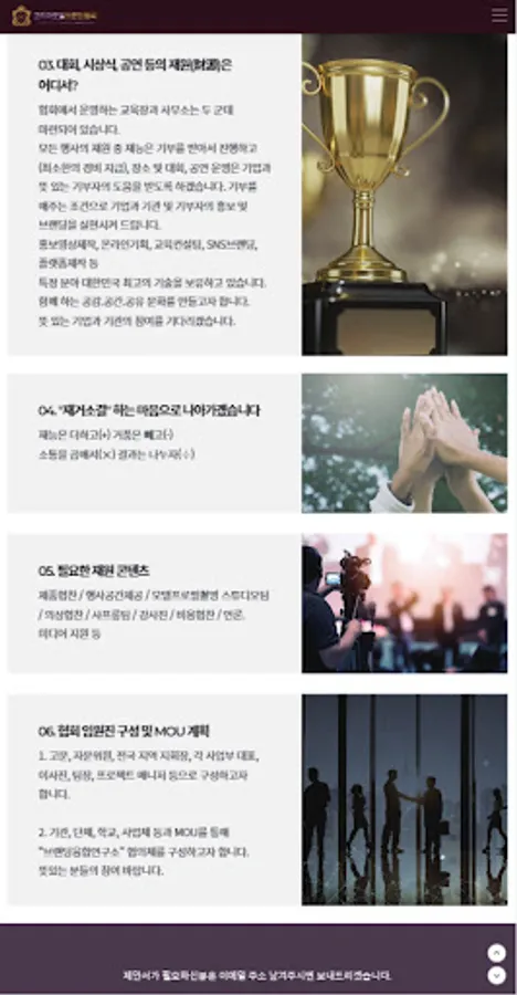 The Korea Model Branding Association contributes to the balanced cultural development and increase of exchanges in the region, as well as the creation of new jobs and corporate publicity activities through linkage with companies through the social contribution of young and old seniors and participation in local performance culture.