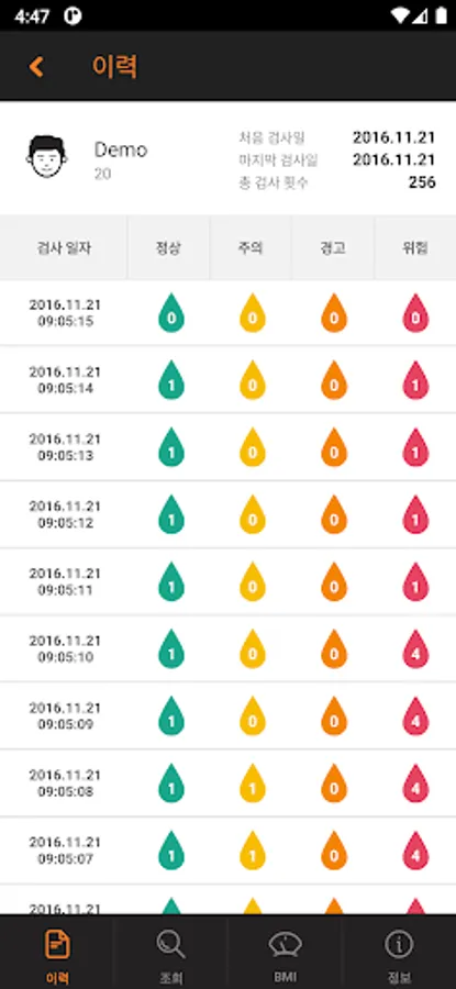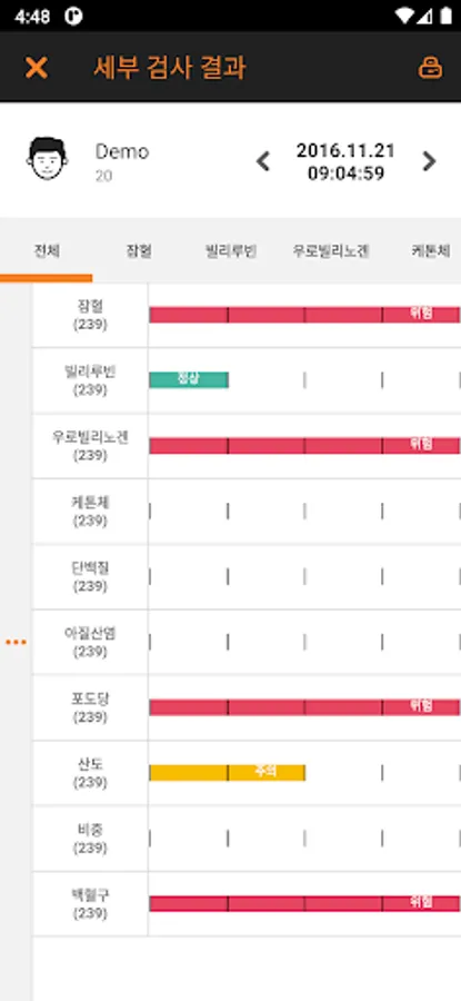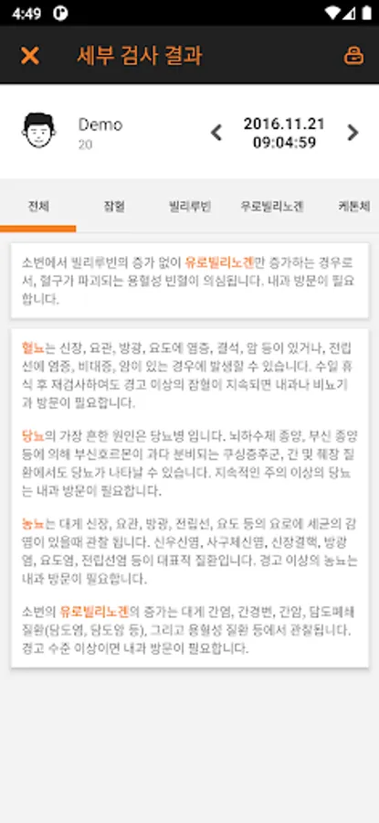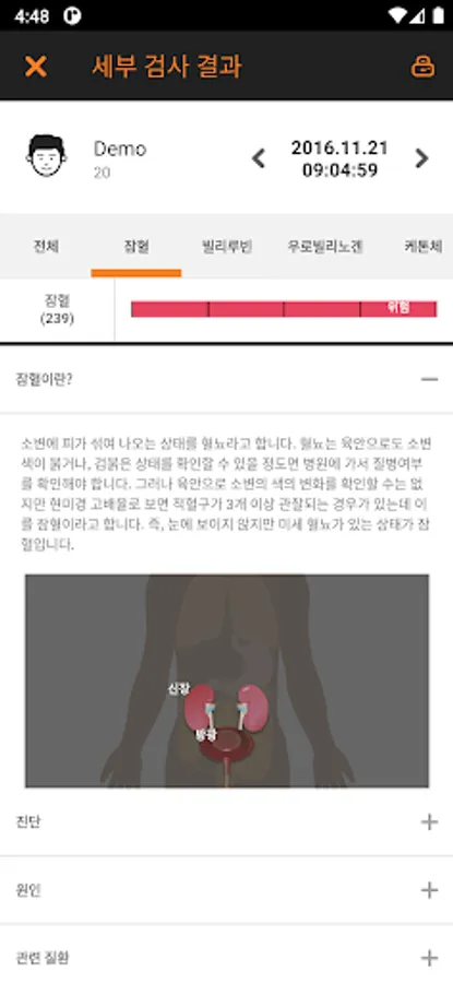 Yodak DM can inquire results by period and item for 10 urine analysis items (occult blood, bilirubin, urobilinogen, ketone body, protein, nitrite, glucose, acidity, specific gravity, white blood cell). According to the test standard, normal, caution, warning, and dangerous states are indicated, allowing the patient to self-diagnose, and based on the analysis results, early detection of 20 diseases including kidney disease is possible. By sending the data to the cloud server, the attending physician can refer to the patient's test results on the web for medical diagnosis and opinion.