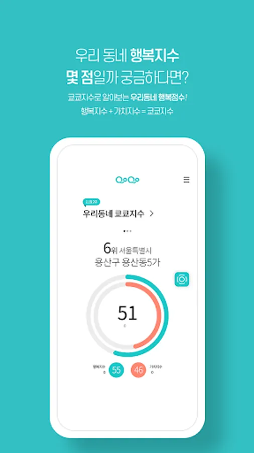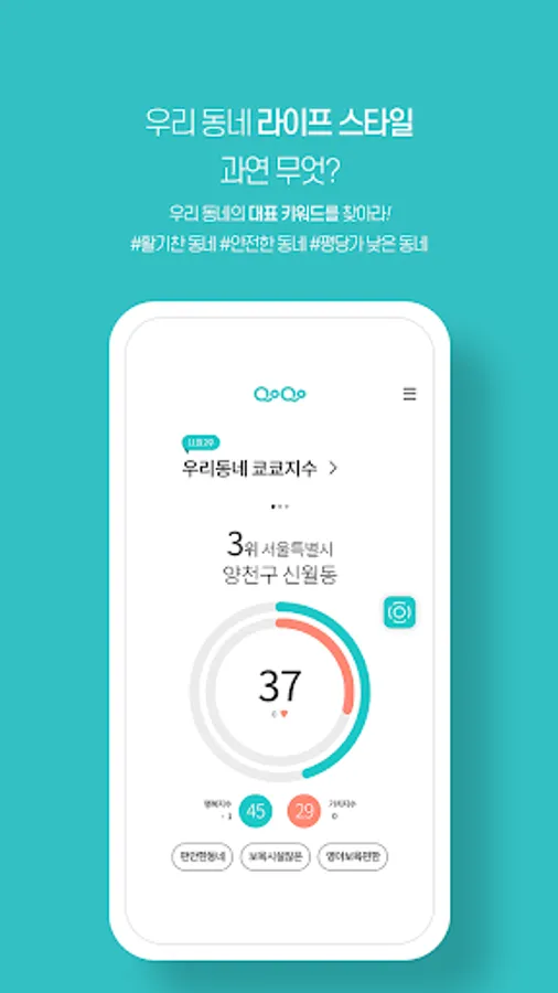 동네의 가치와 행복지수를 통해 개발한 쿄쿄지수로 동네의 행복수준을 알려드려요