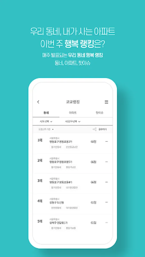 행복동네 찾기 또는 쿄쿄랭킹을 통해서 내가 살고 싶은 혹은 관심있는 동네와 아파트를