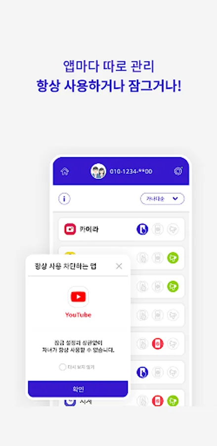 As a service for SKT youth protection, it provides various youth protection functions such as smartphone addiction prevention, school violence prevention, harmful content blocking, child location inquiry, and child trouble notification in one integrated app.