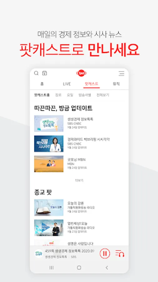 - Podcast main contents: JTBC China Class, JTBC Newsroom, SBS I Want to Know It, YTN The News, TV Chosun News 9, MBN Newswide, Arirang Radio Super K-POP, MBN Pandora, Catholic Peace Broadcasting Radio Today's Sermon , MBN Mystery Show Dongchimi, SBS Curious Story Y, JTBC China Do-ol, JTBC Kim Je-dong’s Talk to You, etc.
