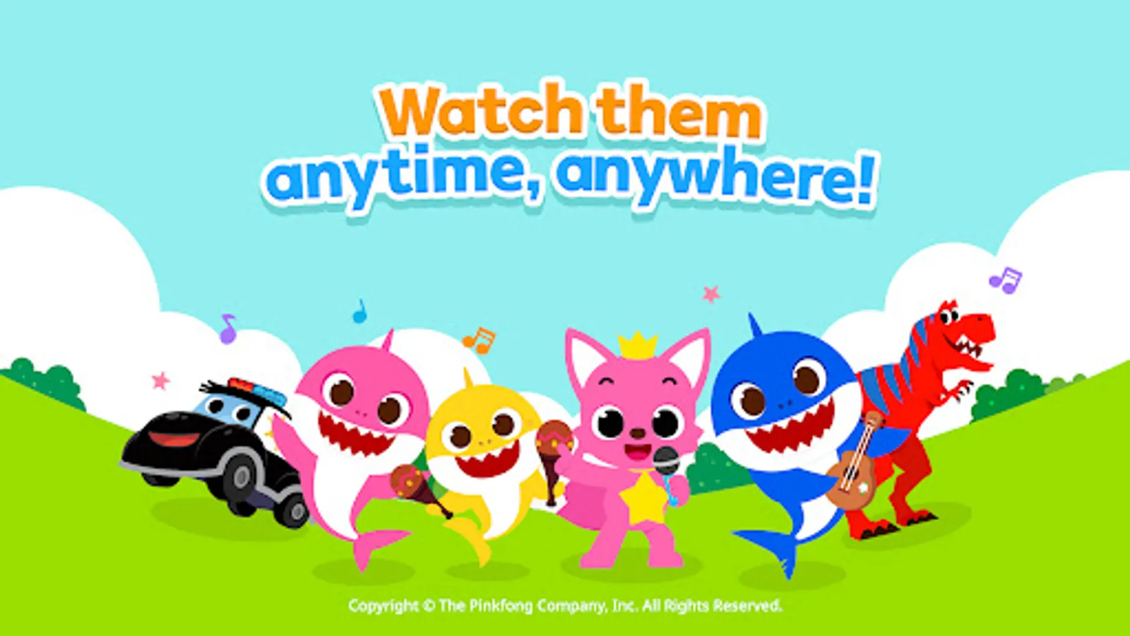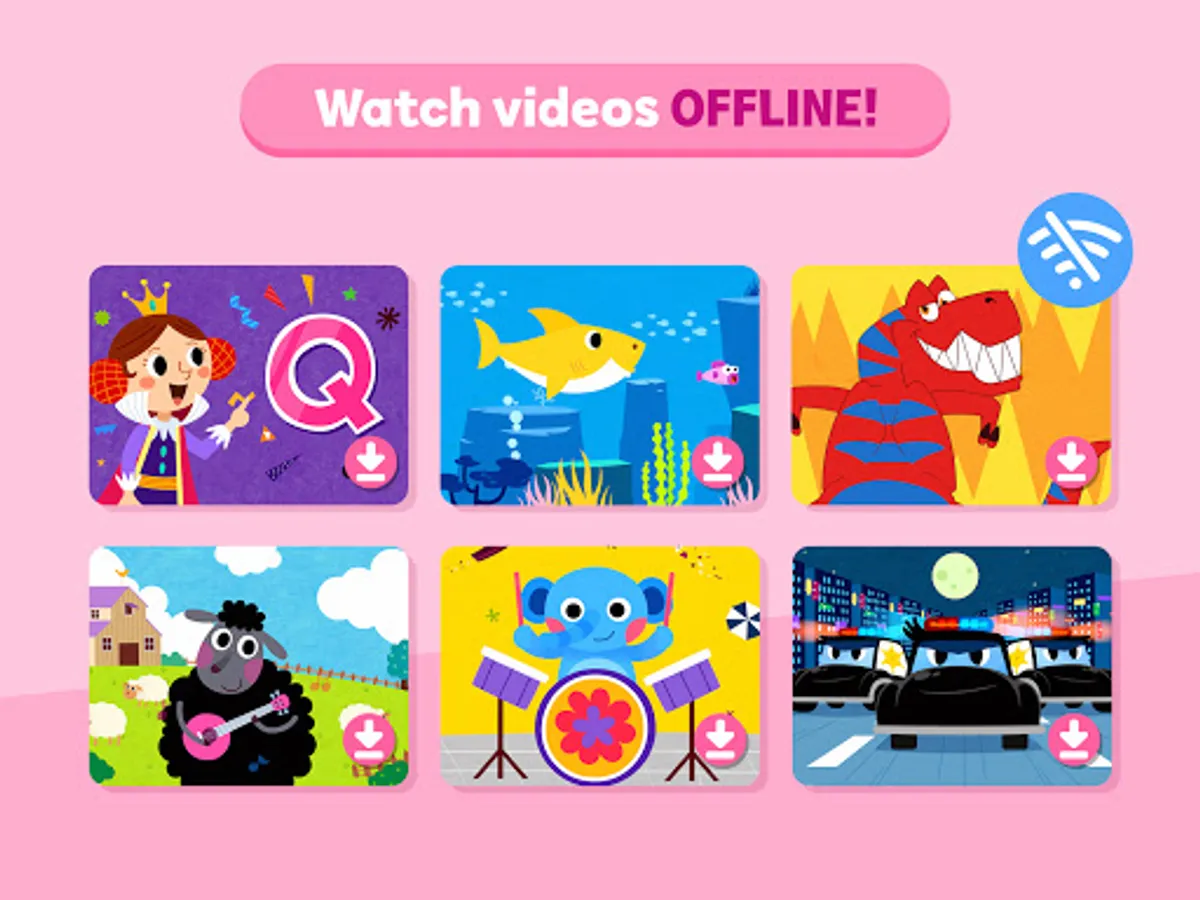 Watch over 1,000 videos featuring Pinkfong, Baby Shark, nursery rhymes, cars, ABCs, numbers, shapes, dinosaurs, princesses, and more, without internet connection.