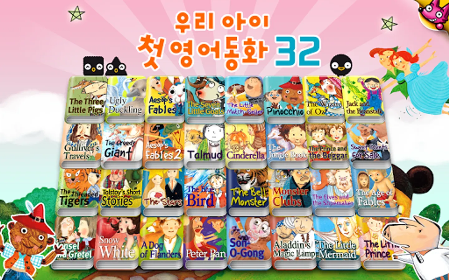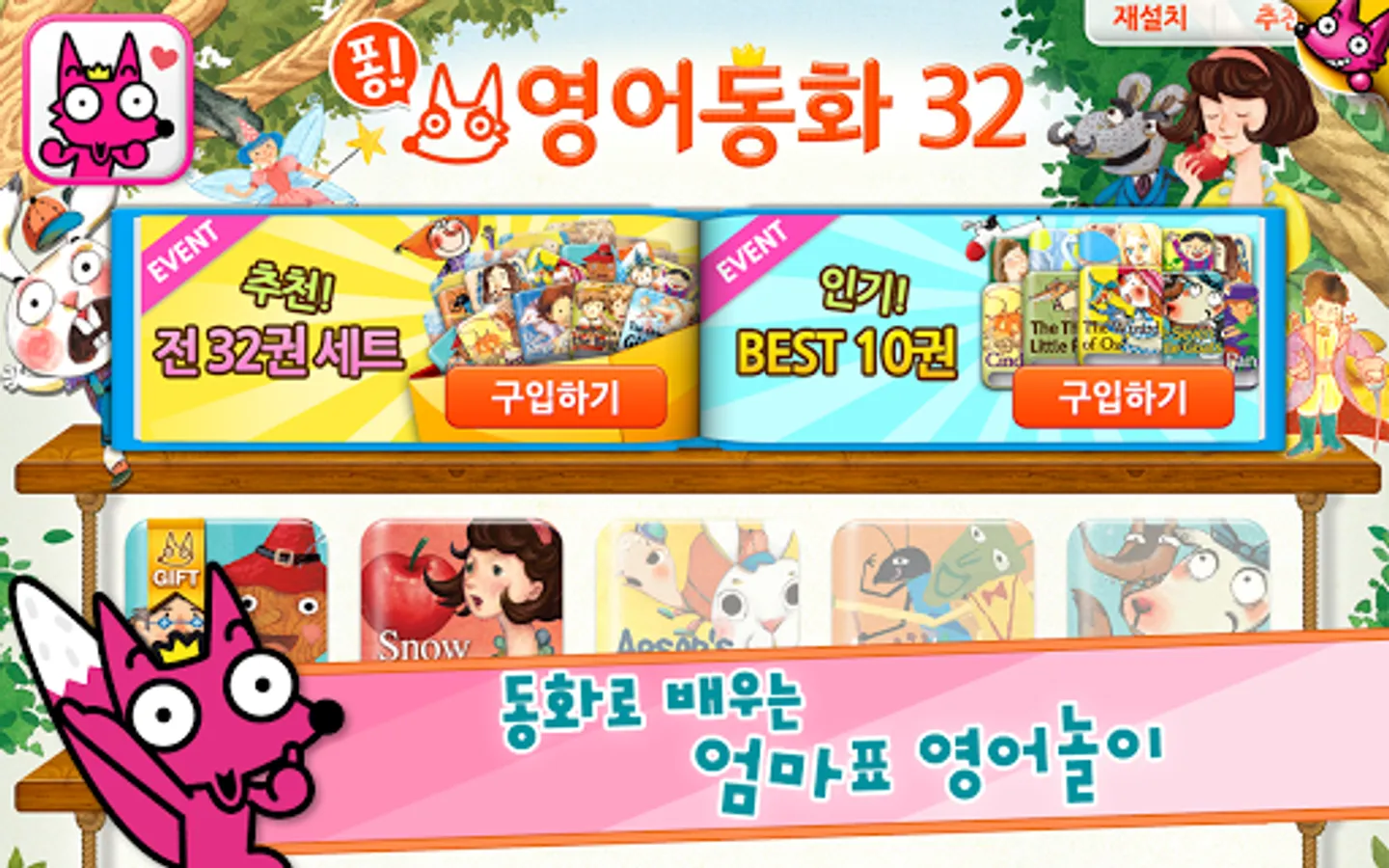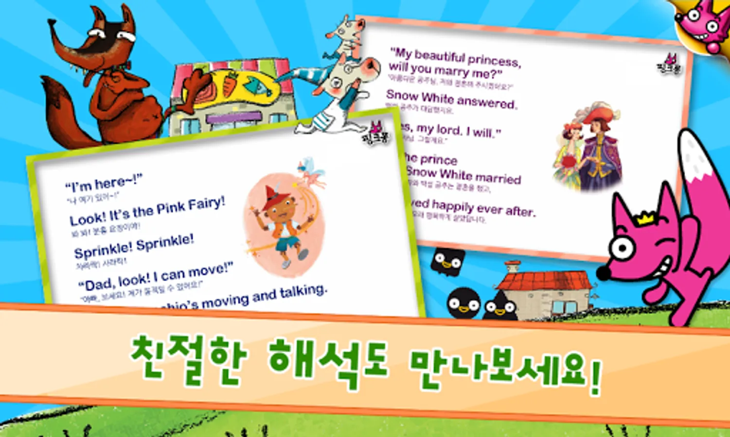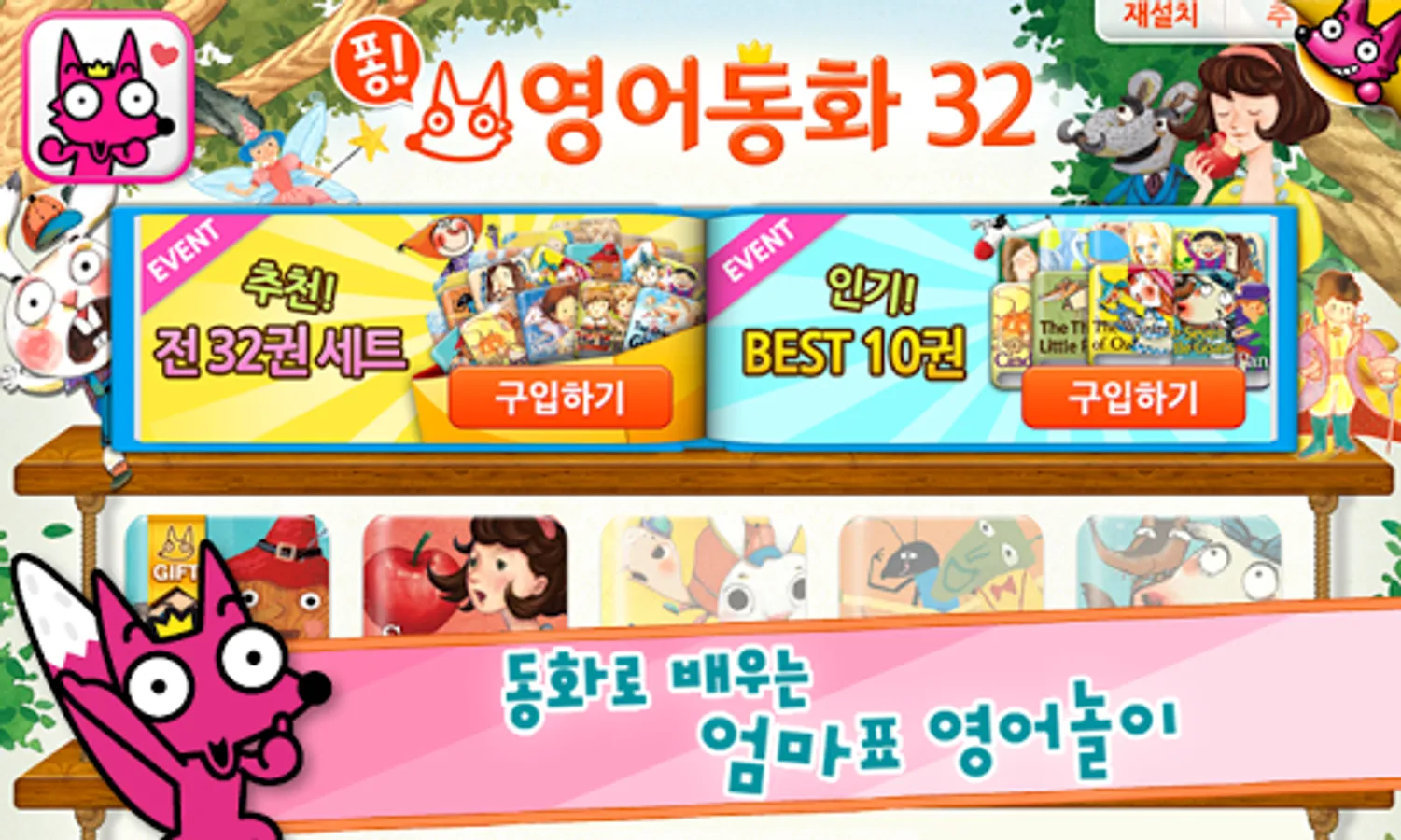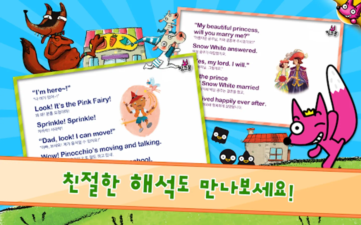 [Pink Fong! English Fairy Tales 32] is composed of only popular stories for children so that children can easily and fun become acquainted with English. While watching and listening to English fairy tales, children can effectively grasp the meaning of what they know by connecting them to English. Rhythmic words, such as exclamation words and onomatopoeia, are expressed with moving letters to make it easier to understand their meaning. Children's concentration is also improved thanks to vivid sound effects such as wind and animal sounds and realistic voice acting! English proficiency is also improved! UP!
