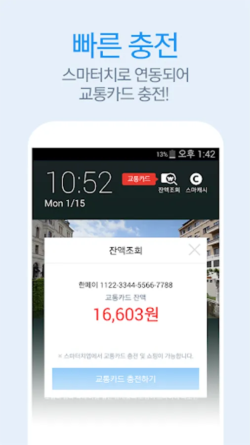 Smart Touch Lock is an app service that works with Smart Touch to allow transportation card smart cash accumulation (free recharge) and balance inquiry.