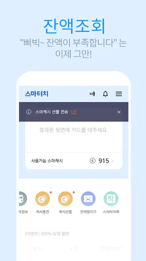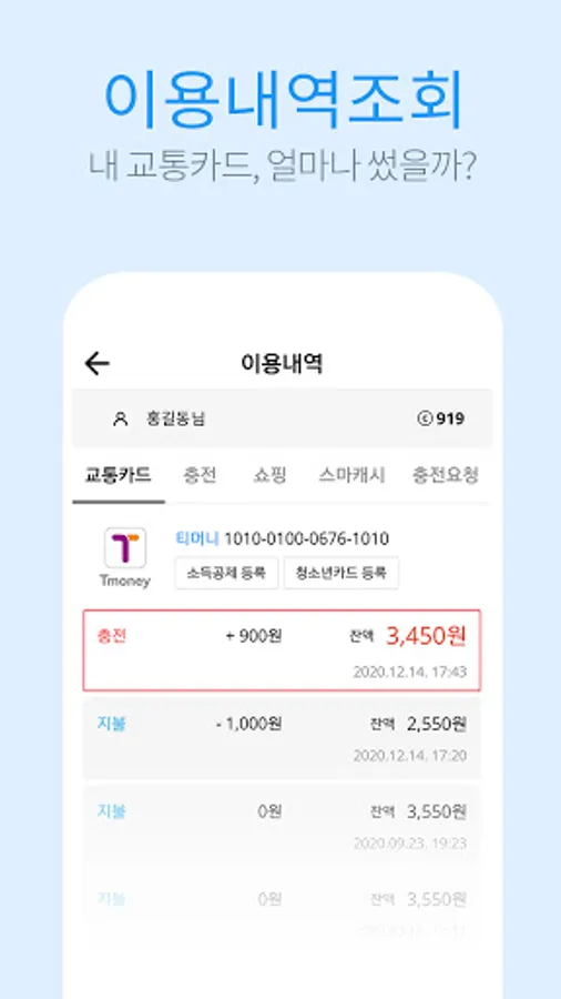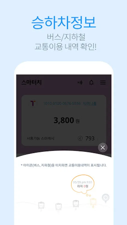 It is an app that provides transportation card-related services such as plastic transportation card balance/transaction details/boarding and disembarkation information inquiry, transportation card charging/free charging (smart cash), shopping/gift using the NFC function of a smartphone.