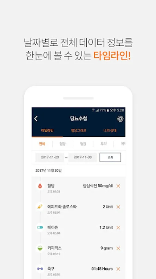 - Calendar: You can see the registered blood glucose and blood test date by date.
