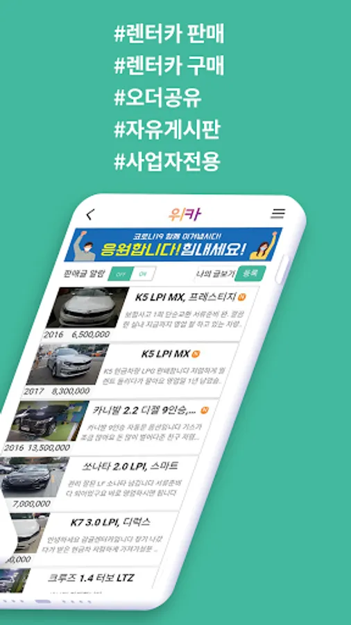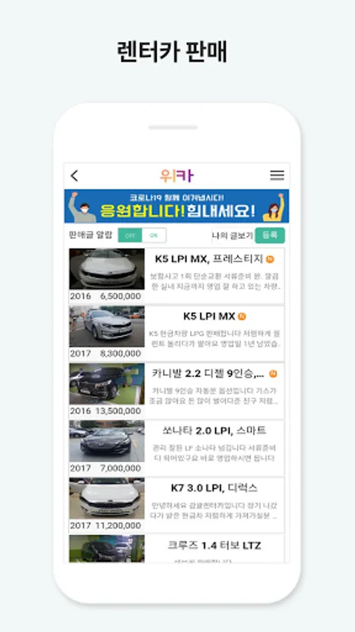 You can receive an alarm at any time when a property is registered through the push notification ON / OFF function at the top of the rental car sales / rental car purchase bulletin board.