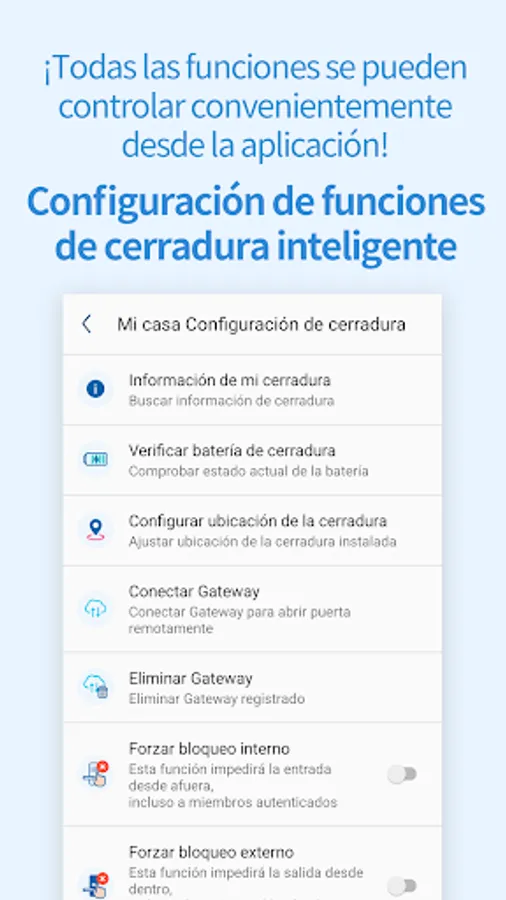 (6) Configuración: Bloqueo forzado, bloqueo manual, control de volumen, actualización de software y mucho más.