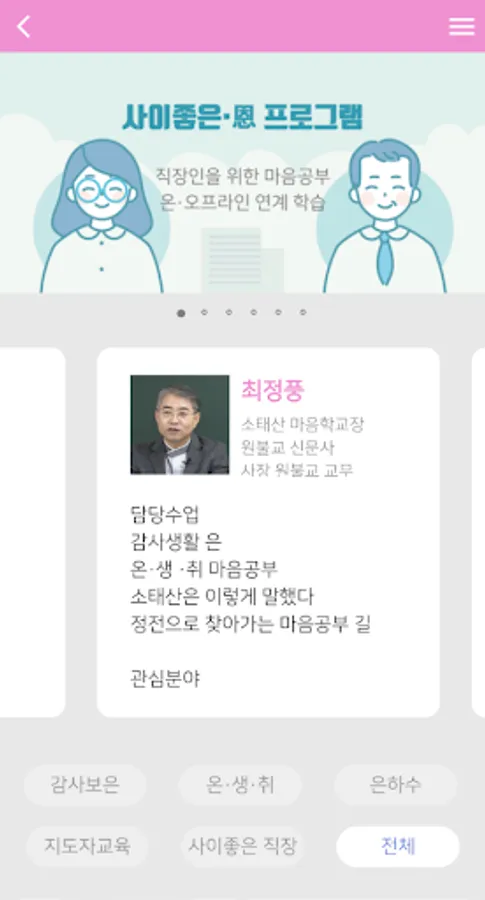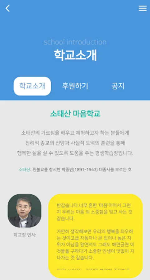 Through the simple mind study of Sotaesan, which only the Mind School has, I want to help you to experience how to cultivate the power, wisdom, and practical power of the mind by realizing that you, I, you, abandonment, and all things in the universe are precious and precious relationships. Although the beginning is minimal, we want to make a great lifelong learning system by adding effort and devotion. We ask for your interest and support.