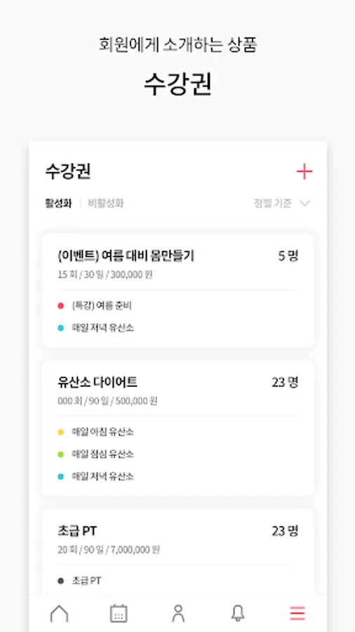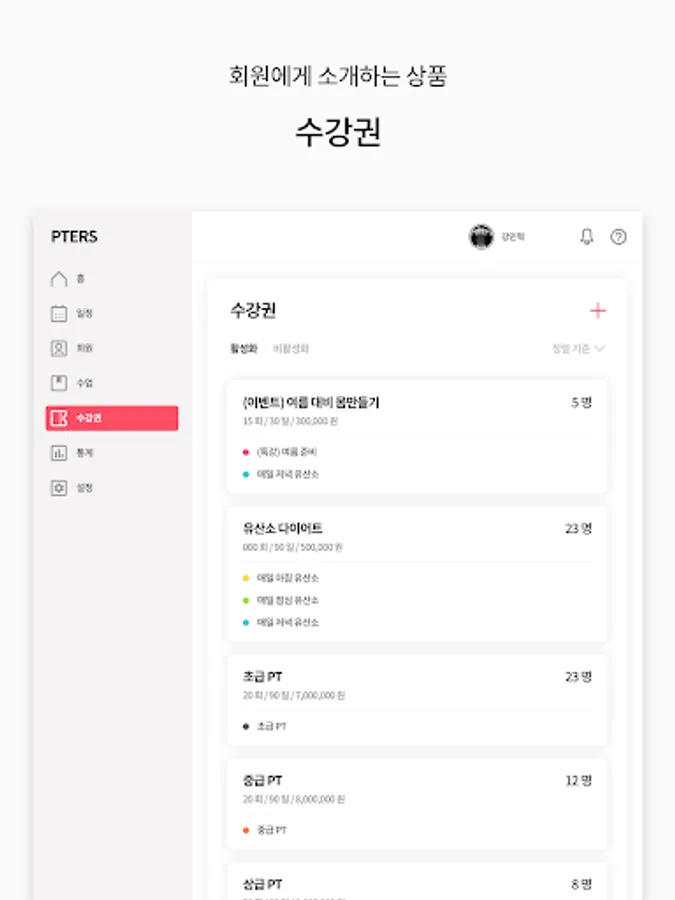 - 회원, 그룹, 수강권 관리기능 :강사에게 등록한 회원 관리 카드 (횟수 차감, 수업 이력, 완료시 사인 저장 기능)