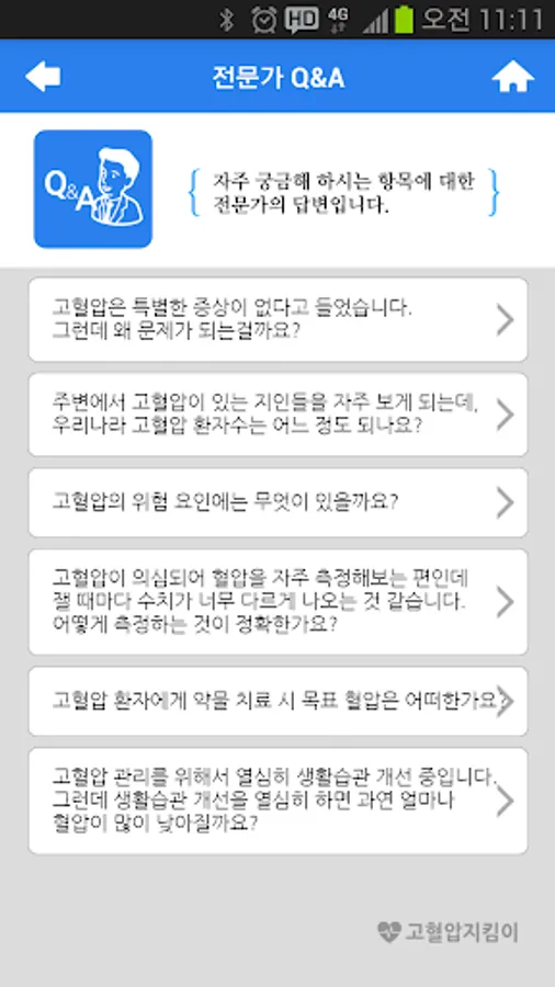 - 고혈압 전반에 대한 질문과 그에 대한 전문가 답변이 구성되어 있습니다.