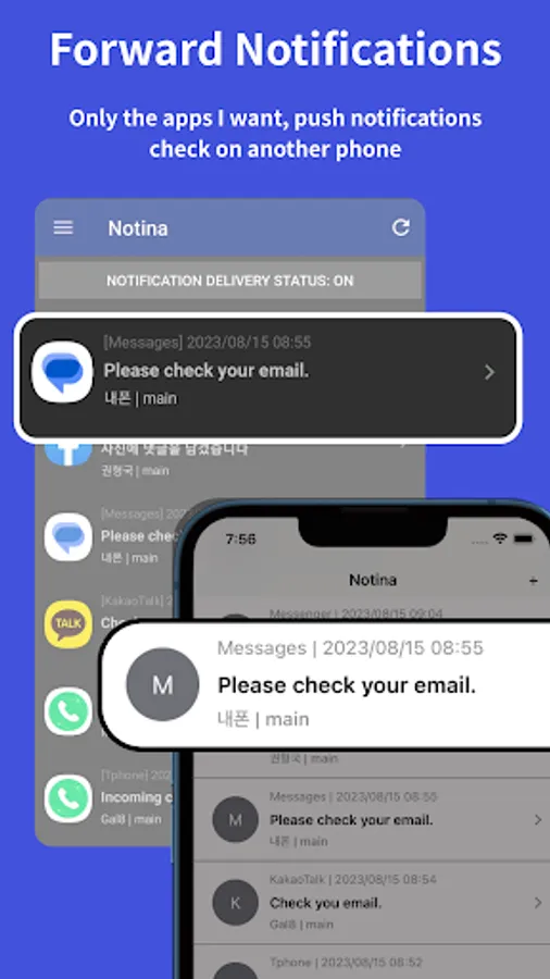 Just install the Notina App on each of your phones and log in with the same email, and it will deliver notifications from the subphone to other phones.