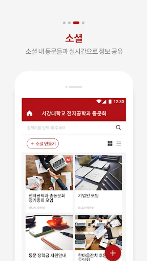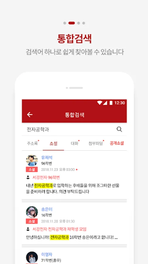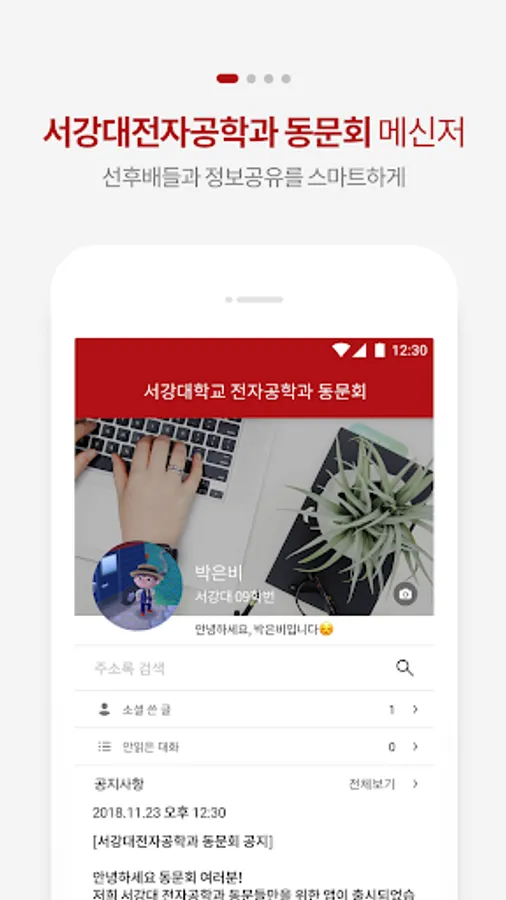 A dedicated app for communication and collaboration between the Department of Electronics Engineering at Sogang University and the address book for each student number and the integrated communication room. Sogang Univ.