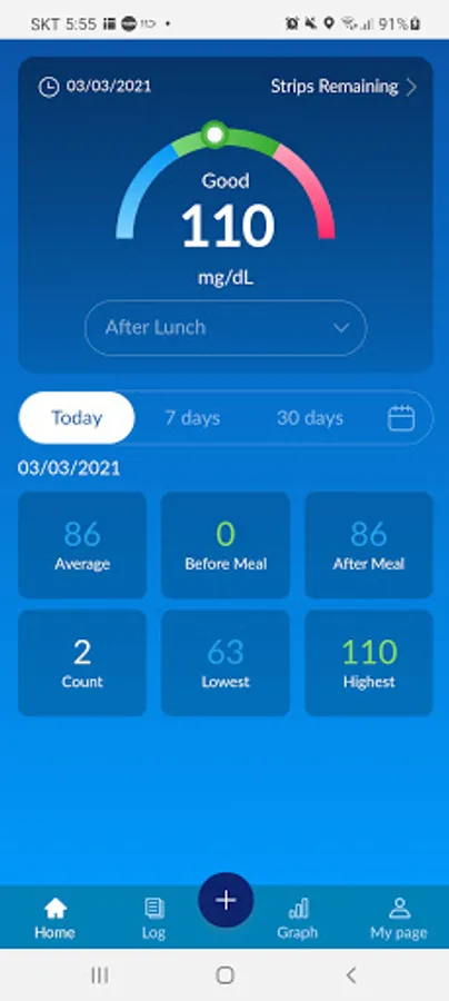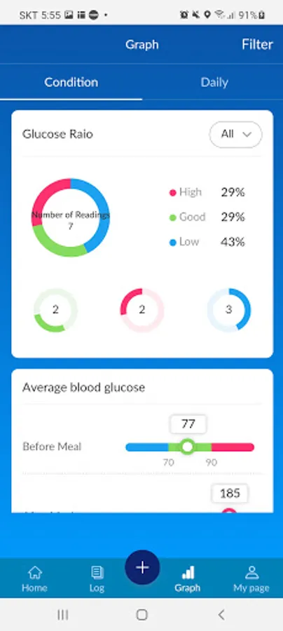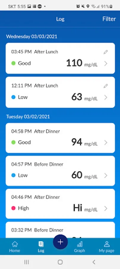 - 7-Day, 30-Day, 3 Month or Custom of blood sugar Log