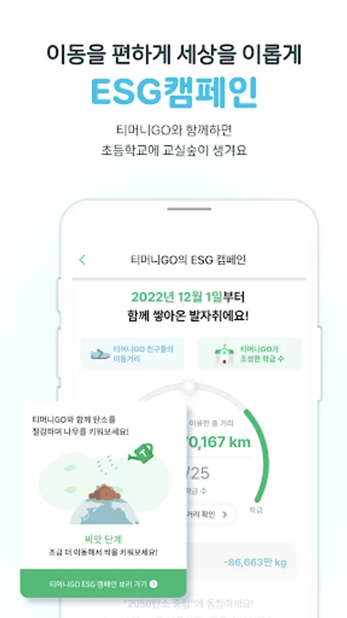 ■ ESG Campaign · An ESG campaign is implemented according to the total distance traveled by T-money GO members. Check out our ongoing ESG campaigns.
