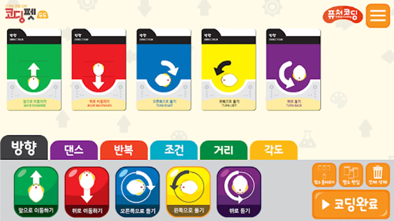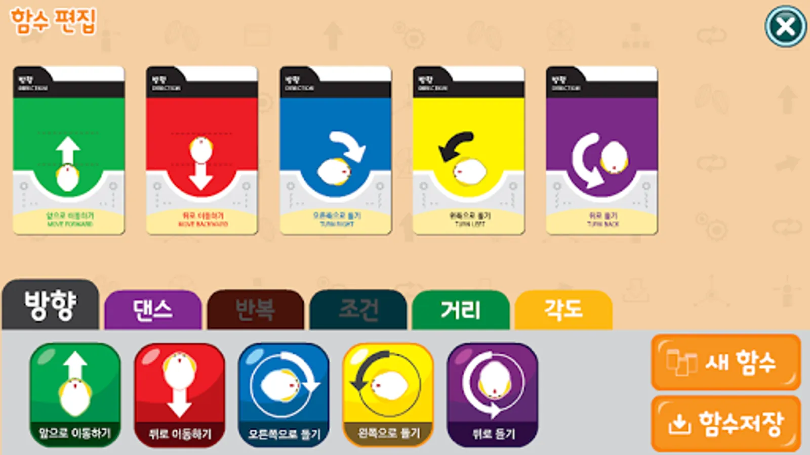 Use the iteration, condition, function, distance, and angle cards.