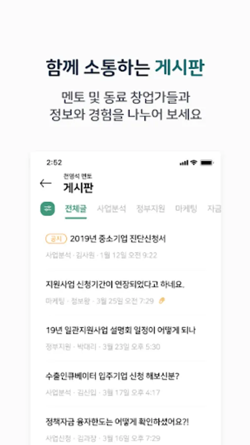 [게시판]에서 멘토 및 동료 창업가들과 정보와 경험을 나눌 수 있습니다.