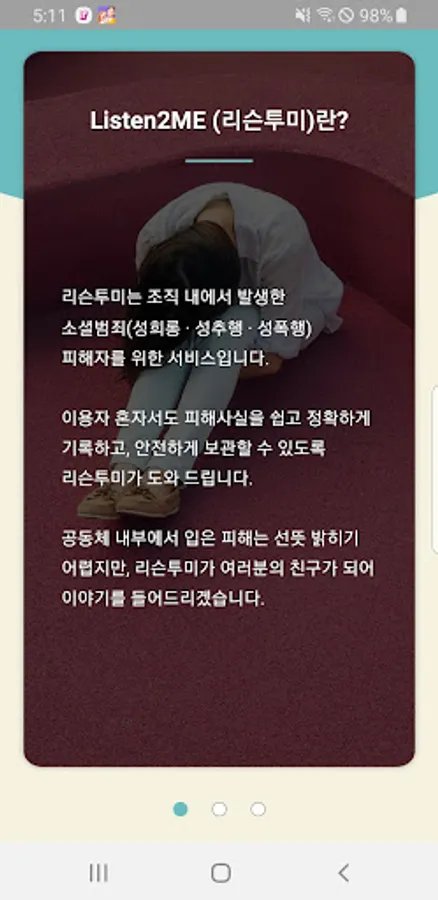 Designed with a victim-centric philosophy, victims can initiate a response without revealing their identity. Damage response starts with a quick and accurate record first, and ListenToMe has prepared various devices for this purpose.