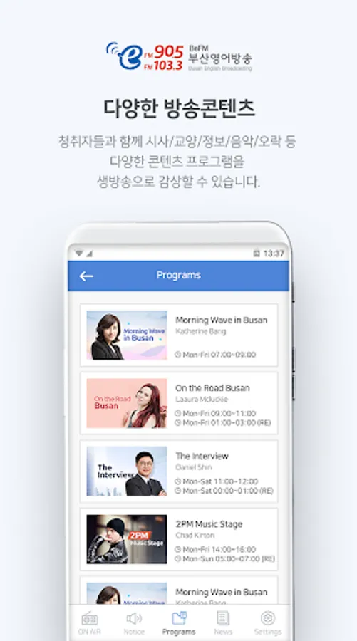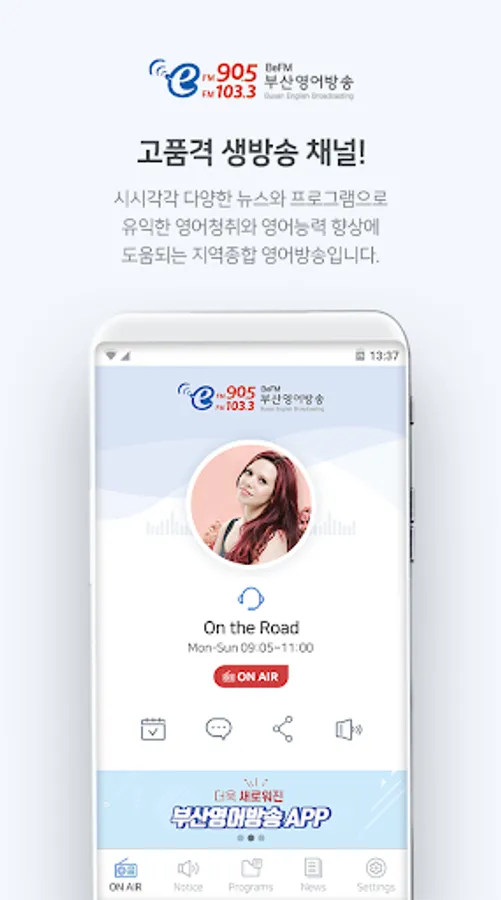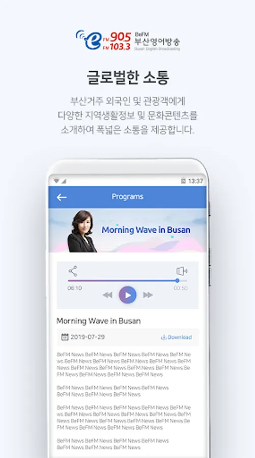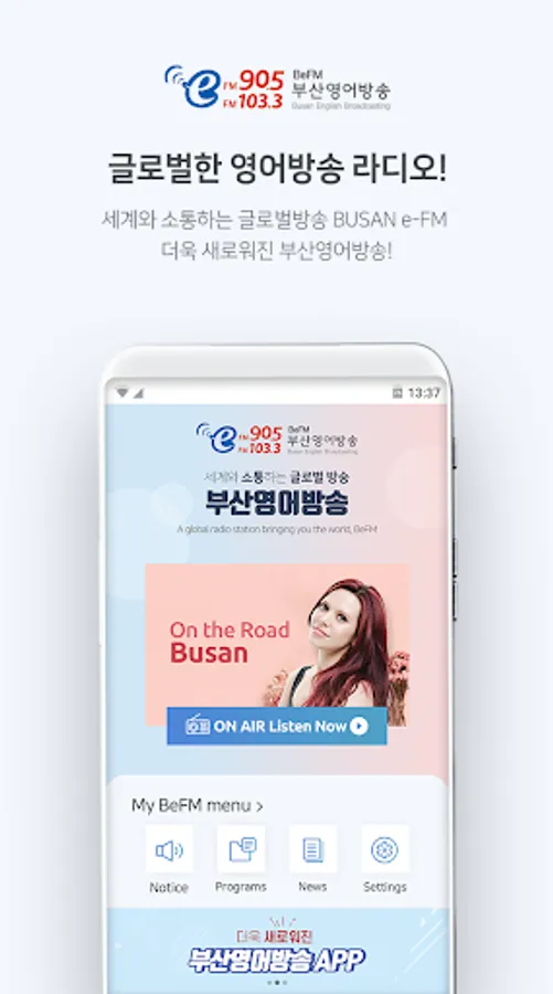 Busan e-FM's smartphone application will enable you to listen to live broadcasts in real time in the palm of your hand so that you can access a wide range of information including news, weather forecasts, and AODs.