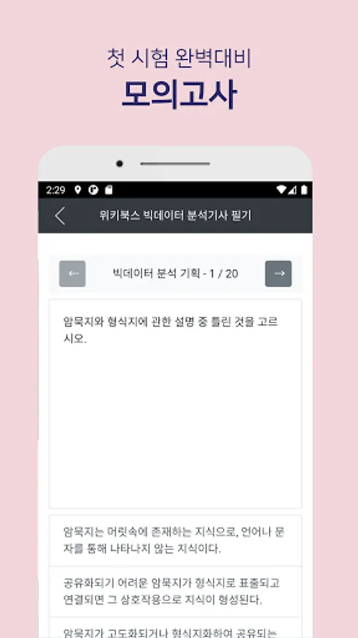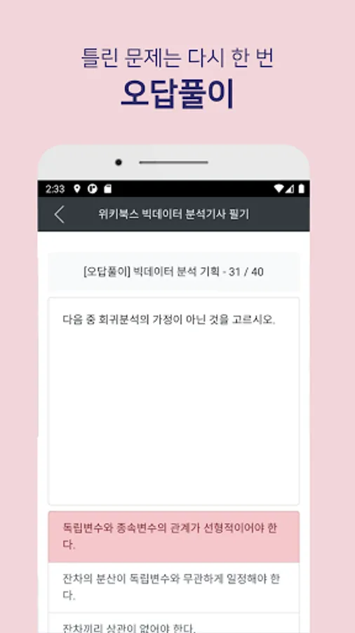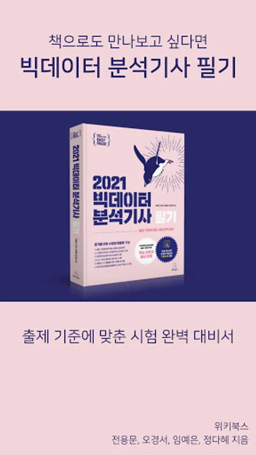 Efficiently prepare for the test with the book 《2021 Big Data Analyzer Handwriting》 (3 writings including exclusive text, Wikibooks), which thoroughly analyzes and thoroughly reflects the criteria and scope of the big data analysis article test hosted by the Korea Data Industry Promotion Agency. This app is for you.