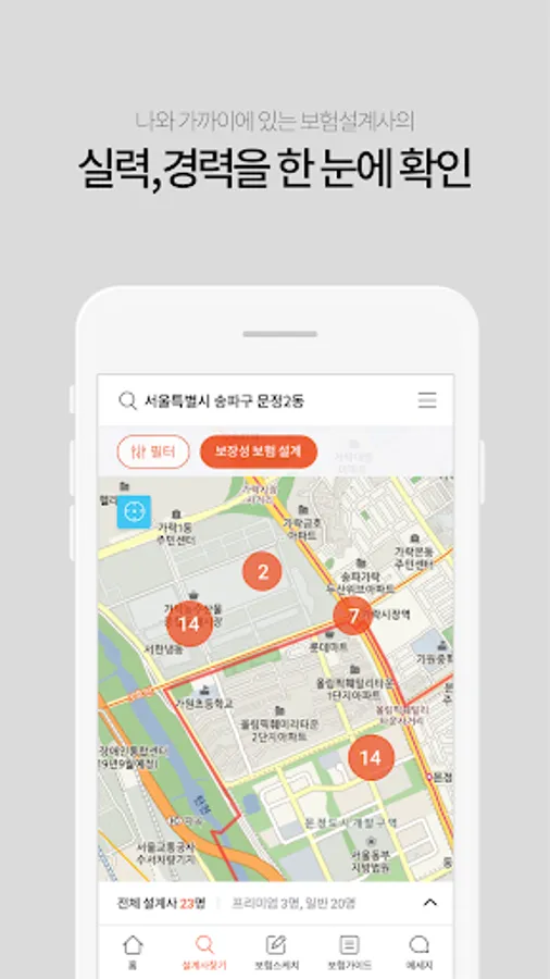 - 나와 가까운 곳에 있는 설계사들의 경력과 능력을 한 눈에 비교할 수 있습니다.