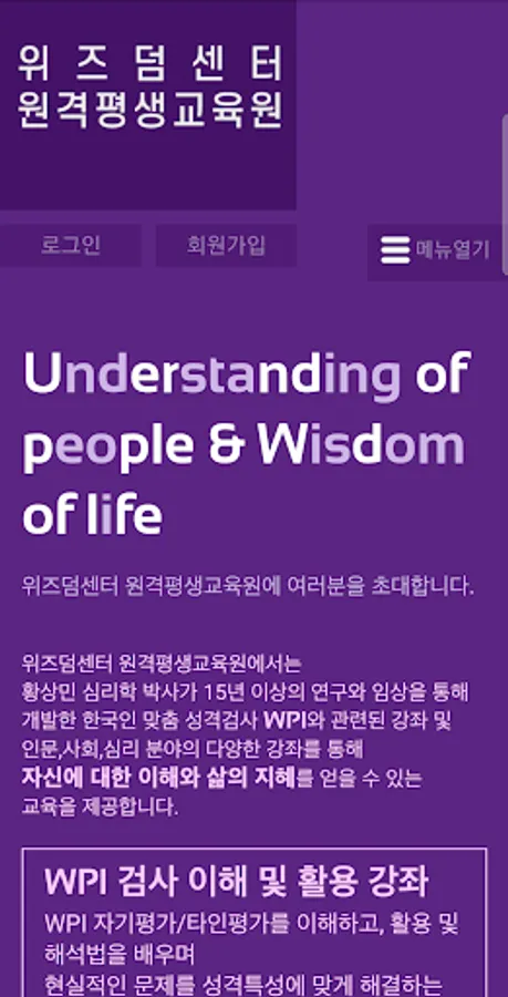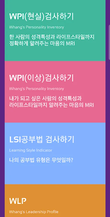 It is an education + psychological test platform that provides education on psychological counseling and coaching using WPI, lectures by Dr. Sang-Min Hwang, Korea's leading psychologist, and various psychological tests developed by Dr. Sang-Min Hwang.