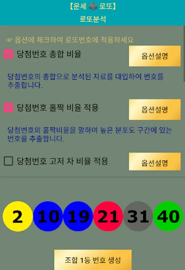 옵션은 로또번호 발생으로 유명한 로또리치등과 같은 유료 사이트와 같은 확률을 이용하실 수 있습니다.