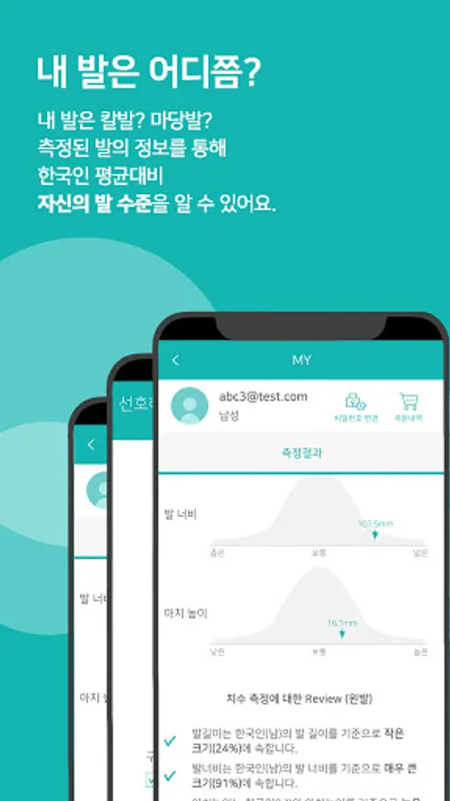 For the measured foot length, foot width, and arch height, we will inform you of the level of inner foot using the distribution of Korean feet. You can check the length of your feet to see if your feet are large or small. And check the difference in length between the right and left feet. The statistical analysis results provided by the app were statistically analyzed in X-Shoo based on the foot data of Koreans provided by Size Korea. You can also check the width of the left and right feet. Compared with the distribution of Koreans' feet, it also tells you whether my feet are flat feet or cut feet. Also, you can check the arch height of the left and right feet. If the arch is lowered, it can lead to flat feet, so check in advance to prevent it.