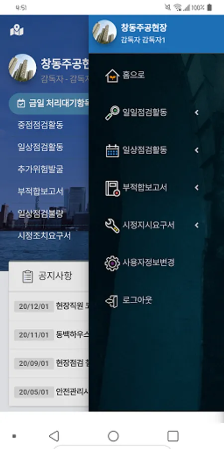 ① Site manager: Manages/operates critical inspection activities, daily inspection activities, additional risk discovery, nonconformity reports, routine inspection defects, corrective action requests, and defects requiring corrective actions.
